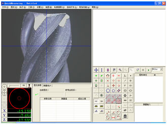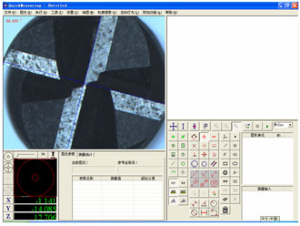 刀具測量軟件除了具備測量軟件的常用功能外,增加視頻區(qū)的十字線對位功能,通過鍵盤方向鍵調(diào)節(jié)十字線可以快速的測量出刀口的角度??梢酝ㄟ^鍵盤數(shù)字鍵1、2快速切換CCD鏡頭,從而能從不同角度和方向觀測被測物體。在測量工作區(qū)域中,增加了六個快速檢測距離的功能.點(diǎn)到點(diǎn)的距離,點(diǎn)到直線的距離、 線到線的距離、 圓心到直線的距離、 圓心到圓心的距離、圓環(huán)的厚度。