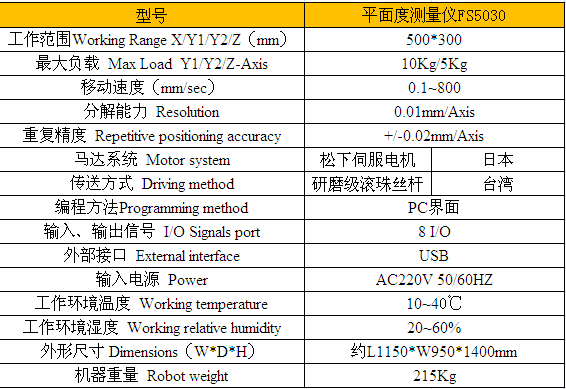高精度大理石基座及平板保證極高的平面精度以及穩(wěn)定性和剛性. 精密研磨級(jí)滾珠絲桿及線性導(dǎo)軌,配松下伺服馬達(dá)具有高速精確的定位以及運(yùn)動(dòng)的穩(wěn)定性. 人性化的人機(jī)界面,配我司專用全自動(dòng)平面測(cè)量軟件,可編程自動(dòng)檢測(cè),大大提高測(cè)量效率. 含基恩士LK-G10或LKG30激光,可以快速測(cè)量平整度,含電腦,含專用平面度測(cè)量軟件。 | ![]() |