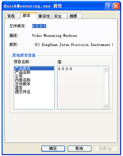 二次元影像測量儀、二次元檢測儀、二維影像儀QuickMeasuring測量軟件需要重新安裝時(shí),因軟件重裝會將原有的數(shù)據(jù)覆蓋,導(dǎo)致之前設(shè)置或補(bǔ)償好的參數(shù)等數(shù)據(jù)無法復(fù)原,所以我們有必要在安裝系統(tǒng)或軟件前將數(shù)據(jù)文件重新備份,可在一次安裝軟件時(shí)直接使用,不用再做重復(fù)的數(shù)據(jù)參數(shù)設(shè)置工作。在備份數(shù)據(jù)之前請先確認(rèn)QuickMeasuring測量軟件安裝目錄,默認(rèn)路徑C:\Program Files\QuickMeasuring(S)下(對電腦桌面QuickMeasuring圖標(biāo)鼠標(biāo)右鍵->屬性->快捷方式->查找目標(biāo)),打開軟件所在目錄,找到QuickMeasuring.exe文件,確認(rèn)QuickMeasuring.exe文件版本(鼠標(biāo)右鍵->屬性->版本),如圖: